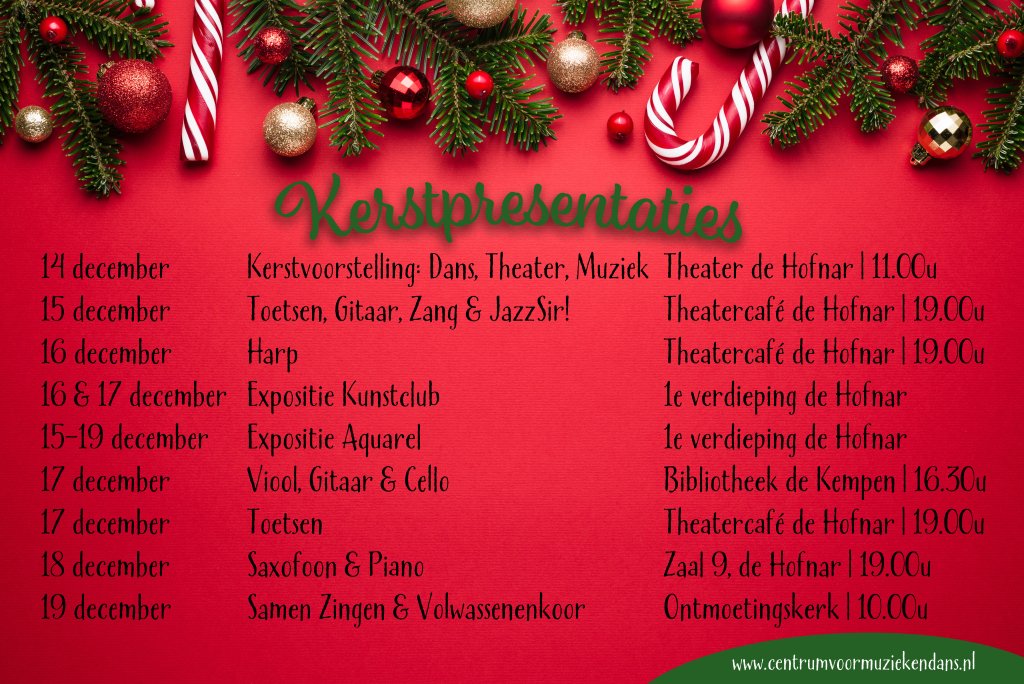 Op de gangen horen we al diverse Sint- en Kerstliedjes de revue passeren, dat wil zeggen: er wordt druk geoefend! En waarvoor? Voor het Sintconcertje van de leerlingen van Elisabeth en Christianne, voor onze Kerstvoorstelling op 14 december met dans, theater en muziek (uitverkocht!) en voor diverse Kerstpresentaties. Jazzband, saxofoon, viool, gitaar, Samen Zingen, exposities; er is in de week voor de vakantie van álles (gratis) te bewonderen bij het CMD!