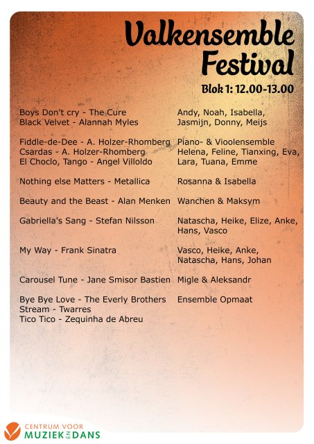 Op zondag 1 februari staat de Theaterzaal van de Hofnar bomvol met live muziek. Onze leerlingen gaan samenwerkingen aan met familieleden, het Valkenswaards Kamerorkest, de Jeugdkapel, diverse ensembles en het Opstaporkest van de Dommelecho. Een feest om mee te maken!