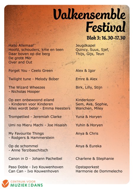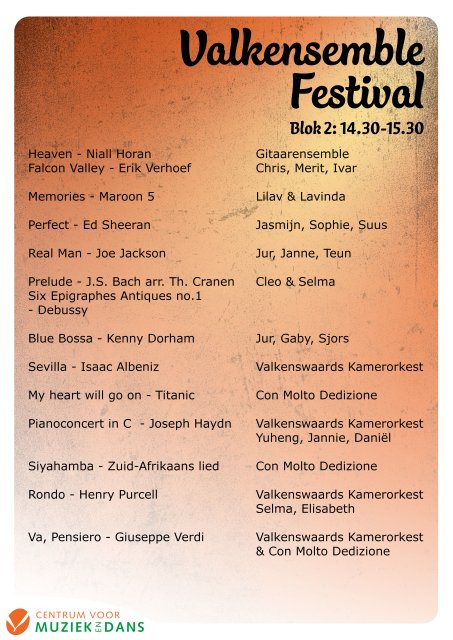 In 3 blokken zullen de optredens plaatsvinden, je kunt als bezoeker naar 1, 2 of alle 3 de blokken komen luisteren. En de entree is gratis!